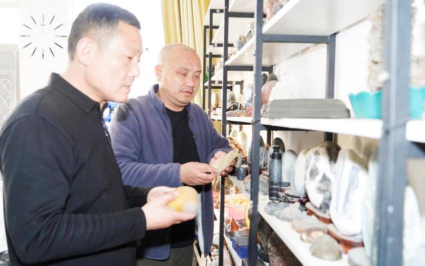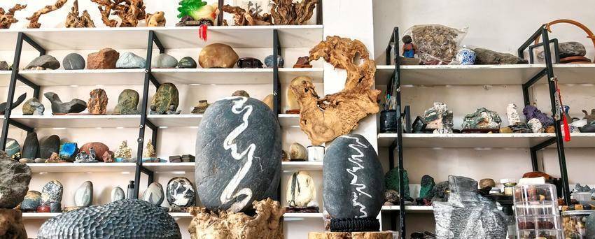 走进他的“悟石堂”,映入眼帘的是满架琳琅,柜台内、地面上各种奇石堆积如山。新疆彩泥石的瑰丽、内蒙戈壁石的粗犷、沙漠漆的温润、北宣石的清雅、冰川石的冷冽、印尼葡萄玛瑙的晶莹、沙漠玫瑰的灵秀……让人目不暇接。俨然一部立体的地质百科书,一卷鲜活的自然风物志。捡石、藏石、评石、赏石已经成为张亦武生活中不可或缺的惬意事。